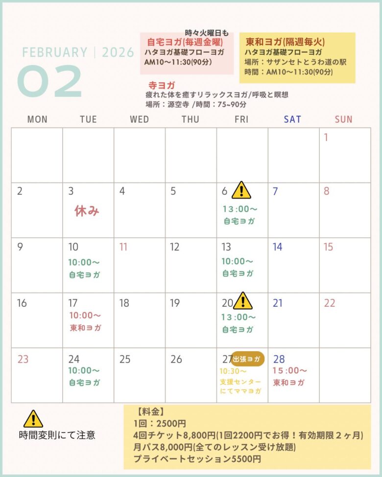 2月ヨガレッスンスケジュールin周防大島