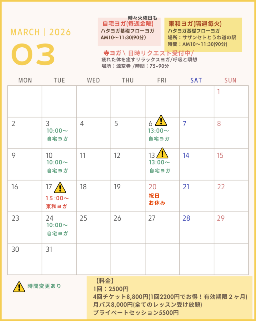 【料金】自宅ヨガ/東和ヨガ/寺ヨガ全て